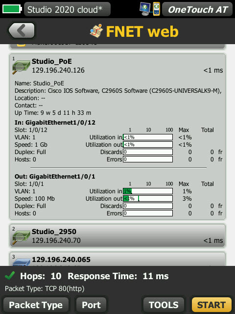 6、自動發(fā)現銅線和光纖連接設備以及關鍵設備屬性。從十四種不同排序中選擇,獲取有線網絡的不同視圖。例如,根據 IPv4 或 IPv6 地址進行排序可識別已使用的和可用的地址。或者根據交換機名稱/槽口/端口進行排序,可以了解網絡設備的連接位置。根據已發(fā)現的問題進行排序可以快速識別潛在的問題。其他發(fā)現輔助型分析工具有助于故障診斷和配置文件創(chuàng)建。例如,多端口信息統計工具可查看交換機、路由器和 AP 端口統計信息,包括速度、duplex、槽口、端口、VLAN、主機數、利用率、丟棄和錯誤。端口工具上的設備可提供單獨交換機端口連接的設備的詳細信息。路徑分析工具提供了從 OneTouch AT 至目標設備的第 2 和 3 層跟蹤路由,包括每次跳轉時間以及 SNMP 交換機和路由器端口統計信息。