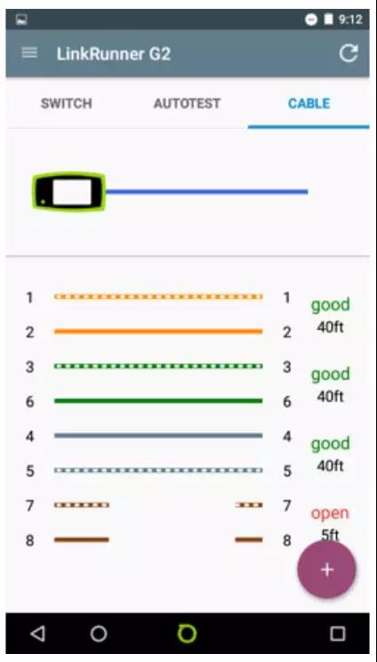幾秒鐘后結果顯示。LinkRunner G2 發出警告提示標明網段的實際速度是 100 Mbps。由于 1000?Mbps 需要用到8根線來傳輸,你懷疑可能是網線出了問題。你把網線的另一端拔出插口并使用 LinkRunner G2?進行線纜測試,測試的結果是第7,8線對在5英尺位置開路。這顯示問題出在線纜。你更換了網線后問題便消失。