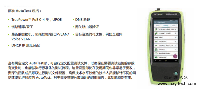 AutoTest 能在數秒之內完成默認的關鍵網絡連接測試,這樣便可以實現測試流程的標準化,幫助網絡技術人員快速而準確地確定問題是因互聯設備、網絡,還是因為 RJ-45 插口缺乏合適的 PoE 造成的。當有需自定義 AutoTest時,可自行定義配置測試文件,以確保在需要測試鏈路的參數有變化時,也能夠執行標準化的測試流程。