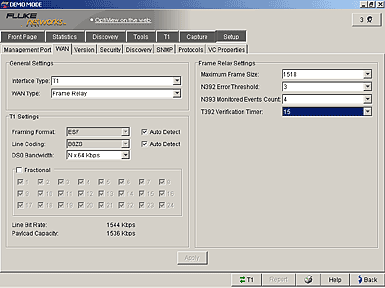 分析儀自動確定鏈路速度(T1 或?E1)、幀格式、鏈路代碼、DLCI 長度、封裝、LMI 類型以及接口類型。用戶可以配置特別的線路參數,包括 DSO 速度、T1 線路分配、最大幀的大小、N392 錯誤門限、N393 監測的事件計數以及 T392 驗證定時器。