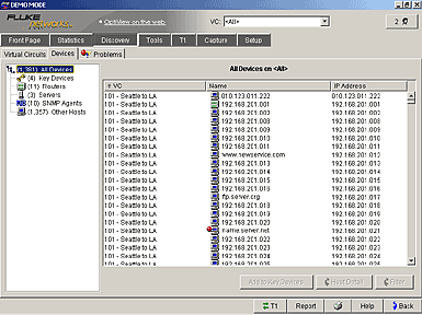 搜索的設備以廣域網鏈路中源和目的IP設備形式顯示出來。對于所有搜索出來的設備,都會顯示出它的IP地址和設備名稱(DNS, NetBIOS 或 SNMP)。 廣域網分析儀以不同的形式將這此設備進行分類,如路由器,服務器,SNMP代理,用戶主機等。如果需要,還可以配置設備列表中來包括不在線的設備。
